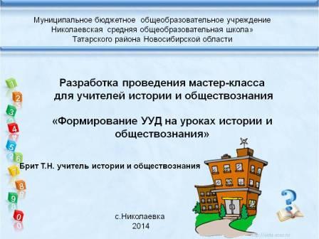 Мастер-класс для учителей истории и обществознания «Формирование УУД на уроках истории и обществознания». Сегодня большее внимание уделяется формированию метапредметных результатов, т.е. универсальных учебных действий, обеспечивающих умение учиться, способность к саморазвитию и самосовершенствованию. Это достигается путём сознательного, активного присвоения учащимися социального опыта. Качество усвоения определяется многообразием и характером видов универсальных действий. Презентация |